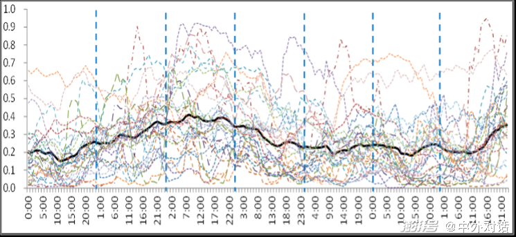 如下圖所示,單一省份(圖中彩色線條)的風(fēng)電出力在不同時(shí)段波動(dòng)較大,但當(dāng)在更大地理范圍做耦合,比如放眼“三北”及華中華東區(qū)域,整體風(fēng)電出力曲線實(shí)現(xiàn)平滑,新能源可以得到更好的消納。