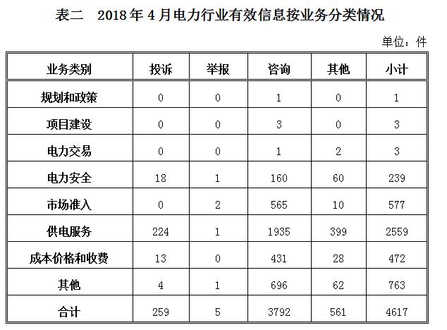投訴舉報(bào)主要集中在電力行業(yè),共264件。從業(yè)務(wù)分類情況看,電力安全方面19件,占7.20%;市場(chǎng)準(zhǔn)入方面2件,占0.76%;供電服務(wù)方面225件,占85.23%;成本價(jià)格和收費(fèi)方面13件,占4.92%;其他方面5件,占1.89%。(2018年4月電力行業(yè)有效信息按業(yè)務(wù)分類情況見(jiàn)表二)