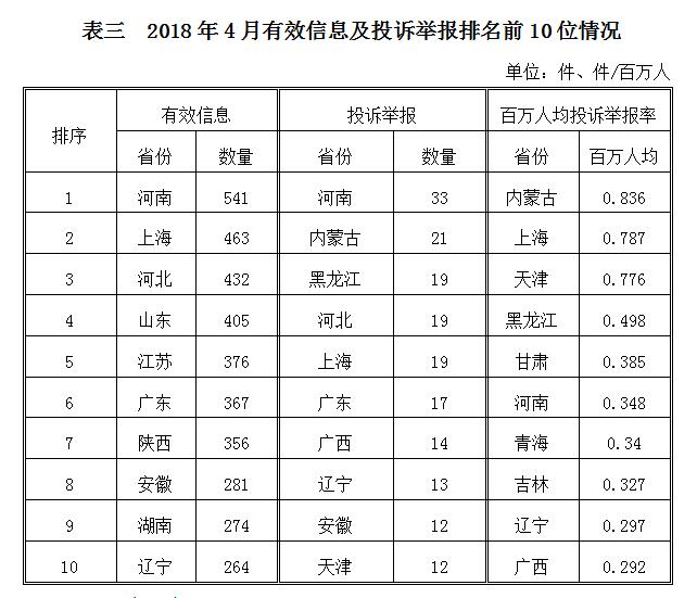 2018年4月,各?。ㄗ灾螀^(qū)、直轄市)按照有效信息數(shù)量排序,河南、上海、河北等省(市)列全國(guó)前10位;按照投訴舉報(bào)數(shù)量排序,河南、內(nèi)蒙古、黑龍江等?。ㄗ灾螀^(qū))排在全國(guó)前10位;按照百萬(wàn)人均投訴舉報(bào)率排序,內(nèi)蒙古、上海、天津等?。ㄊ小⒆灾螀^(qū))位于全國(guó)前10位。(2018年4月有效信息及投訴舉報(bào)排名前10位情況見(jiàn)表三)