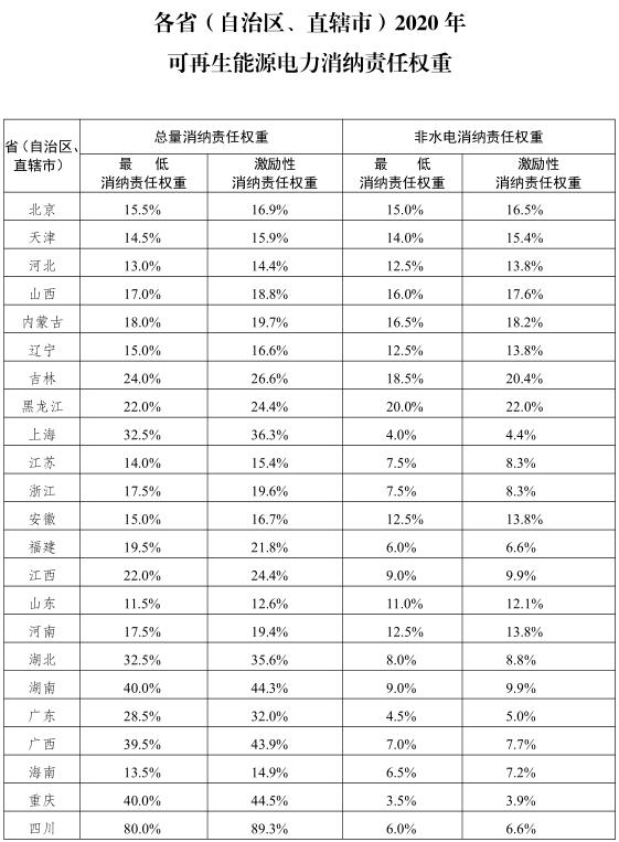 根據(jù)《國家發(fā)展改革委 國家能源局關(guān)于建立健全可再生能源電力消納保障機制的通知》(發(fā)改能源〔2019〕807號),在各地測算的基礎(chǔ)上,我們統(tǒng)籌提出了各省級行政區(qū)域2020年可再生能源電力消納責任權(quán)重,現(xiàn)印發(fā)你們,請認真組織落實。