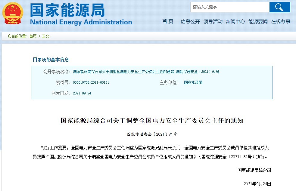 根據(jù)工作需要,全國(guó)電力安全生產(chǎn)委員會(huì)主任調(diào)整為國(guó)家能源局副局長(zhǎng)余兵。全國(guó)電力安全生產(chǎn)委員會(huì)成員單位其他組成人員按照《國(guó)家能源局綜合司關(guān)于調(diào)整全國(guó)電力安全生產(chǎn)委員會(huì)成員單位組成人員的通知》(國(guó)能綜通安全〔2021〕81號(hào))執(zhí)行。