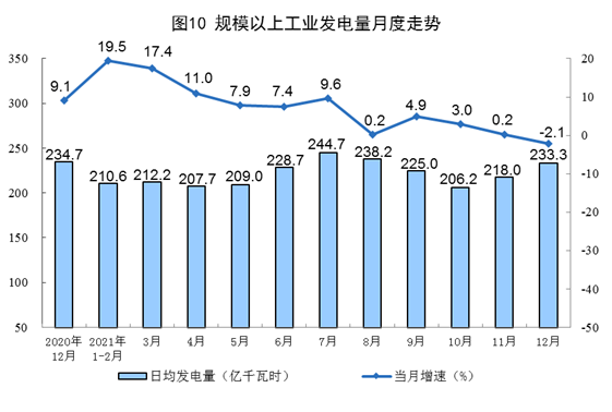 電力生產同比下降。12月份,發(fā)電7234億千瓦時,同比下降2.1%,上月為增長0.2%,比2019年同期增長6.8%,兩年平均增長3.4%,日均發(fā)電233.3億千瓦時。2021年,發(fā)電81122億千瓦時,比上年增長8.1%,比2019年增長11.0%,兩年平均增長5.4%。