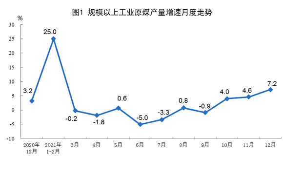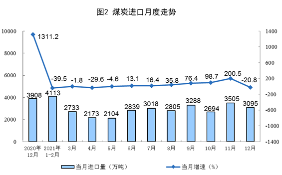 原煤生產繼續(xù)加快,進口由增轉降。隨著增產保供政策持續(xù)推進,12月份,生產原煤3.8億噸,同比增長7.2%,增速比上月加快2.6個百分點,比2019年同期增長10.7%,兩年平均增長5.2%,日均產量1241萬噸;進口煤炭3095萬噸,同比下降20.8%。