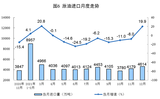2021年,生產原油19898萬噸,比上年增長2.4%,比2019年增長4.0%,兩年平均增長2.0%;加工原油70355萬噸,比上年增長4.3%,比2019年增長7.4%,兩年平均增長3.6%。