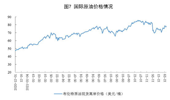 原油進口由降轉增,國際原油價格上漲。12月份,進口原油4614萬噸,同比增長19.9%,上月為下降8.0%;2021年,進口原油51298萬噸,比上年下降5.4%。12月31日,布倫特原油現(xiàn)貨離岸價格為77.24美元/桶,比11月30日的70.86美元/桶上漲9.0%。