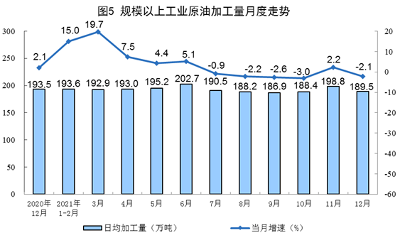 原油生產增速略有回落,加工量由增轉降。12月份,生產原油1647萬噸,同比增長1.7%,增速比上月放緩1.0個百分點,比2019年同期增長2.6%,兩年平均增長1.3%,日均產量53.1萬噸;加工原油5873萬噸,同比下降2.1%,上月為增長2.2%,比2019年同期下降0.1%,兩年平均下降0.1%,日均加工189.5萬噸。