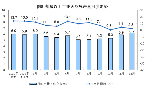 天然氣生產放緩。12月份,生產天然氣192億立方米,同比增長2.3%,增速比上月放緩2.1個百分點,比2019年同期增長16.4%,兩年平均增長7.9%,日均產量6.2億立方米。