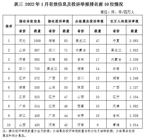 各省(自治區(qū)、直轄市)按照接收的有效信息數(shù)量排序,河北、山東、河南、四川、遼寧、湖南、江蘇、廣東、浙江、山西排在全國(guó)前10位;按照接收的投訴舉報(bào)數(shù)量排序,湖南、四川、云南、黑龍江、廣西、山東、遼寧、江蘇、廣東、河南排在全國(guó)前10位;按照辦結(jié)屬實(shí)的投訴舉報(bào)數(shù)量排序,黑龍江、內(nèi)蒙古、吉林、湖南、四川、陜西、山西、西藏、甘肅、河南排在全國(guó)前10位;按照百萬(wàn)人均投訴舉報(bào)數(shù)量排序,寧夏、黑龍江、內(nèi)蒙古、云南、湖南、廣西、遼寧、天津、吉林、青海排在全國(guó)前10位。(2022年1月有效信息及投訴舉報(bào)排名前10位情況見(jiàn)表三)