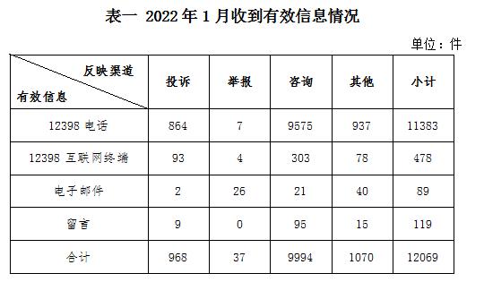 2022年1月,國(guó)家能源局12398能源監(jiān)管熱線(以下簡(jiǎn)稱12398熱線)共收到有效信息12069件(包含投訴、舉報(bào)、咨詢和其他訴求類別),環(huán)比減少10.77%,同比減少6.45%。(2022年1月收到有效信息情況見(jiàn)表一)