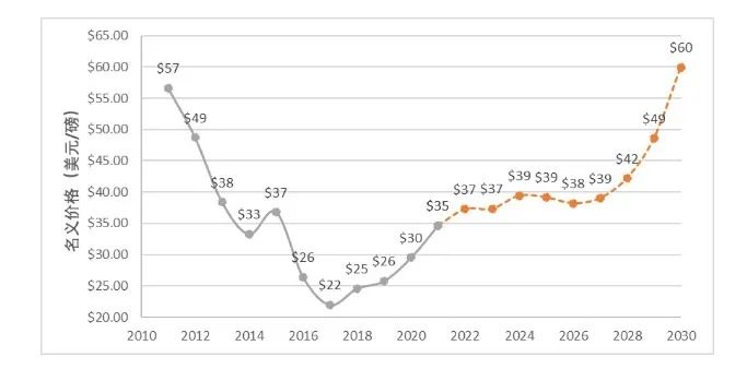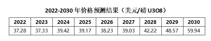 報告還對2022-2030年天然鈾現(xiàn)貨價格作了預(yù)測。之所以選擇對長期現(xiàn)貨價格進(jìn)行預(yù)測,是因?yàn)樵搩r格是反應(yīng)市場供需關(guān)系的主要指標(biāo),是長貿(mào)協(xié)議引用的重要指數(shù),且不易受到短期市場投機(jī)行為的影響。