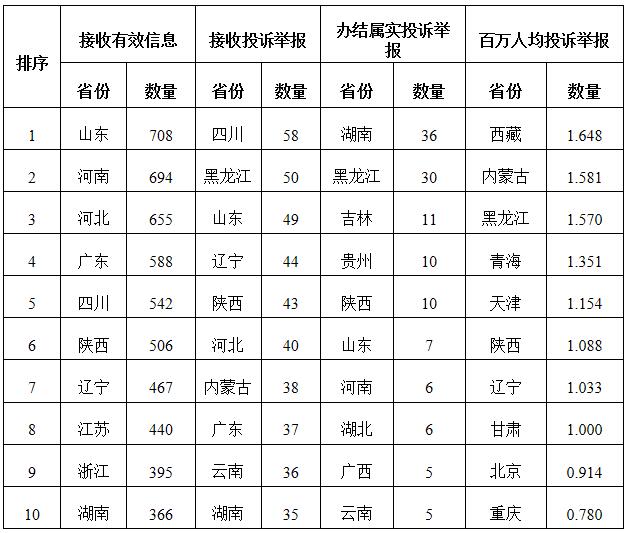各省(自治區(qū)、直轄市)按照接收的有效信息數(shù)量排序,山東、河南、河北、廣東、四川、陜西、遼寧、江蘇、浙江、湖南排在全國(guó)前10位;按照接收的投訴舉報(bào)數(shù)量排序,四川、黑龍江、山東、遼寧、陜西、河北、內(nèi)蒙古、廣東、云南、湖南排在全國(guó)前10位;按照辦結(jié)屬實(shí)的投訴舉報(bào)數(shù)量排序,湖南、黑龍江、吉林、貴州、陜西、山東、河南、湖北、廣西、云南排在全國(guó)前10位;按照百萬人均投訴舉報(bào)數(shù)量排序,西藏、內(nèi)蒙古、黑龍江、青海、天津、陜西、遼寧、甘肅、北京、重慶排在全國(guó)前10位。(2022年4月有效信息及投訴舉報(bào)排名前10位情況見表三)