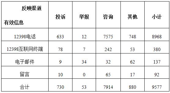 按反映渠道分類,12398電話8968件,12398互聯(lián)網(wǎng)終端380件,電子郵件137件,留言92件。