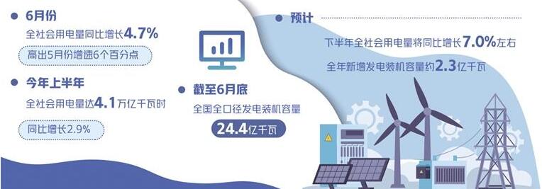 “隨著疫情逐步緩解,穩(wěn)經(jīng)濟(jì)政策效果加快顯現(xiàn),疊加多地高溫天氣因素,6月份全社會(huì)用電量同比增長(zhǎng)4.7%,高出5月份增速6個(gè)百分點(diǎn)。”在近日召開(kāi)的全國(guó)電力供需形勢(shì)半年報(bào)發(fā)布會(huì)上,中國(guó)電力企業(yè)聯(lián)合會(huì)秘書(shū)長(zhǎng)郝英杰表示,6月份電力消費(fèi)增速明顯回升,一定程度上反映出當(dāng)前復(fù)工復(fù)產(chǎn)、復(fù)商復(fù)市取得積極成效。