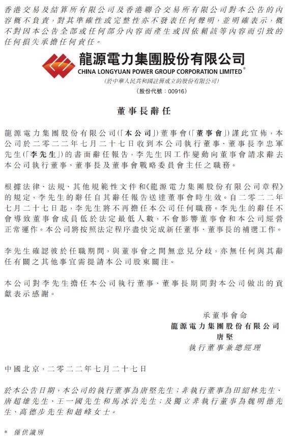 本網(wǎng)訊 根據(jù)公告,龍?jiān)措娏Χ聲?huì)于2022年7月27日收到公司董事長(zhǎng)李忠軍的書面辭任報(bào)告,李忠軍因工作變動(dòng),向董事會(huì)申請(qǐng)辭去公司執(zhí)行董事、董事長(zhǎng)以及董事會(huì)戰(zhàn)略委員會(huì)主任之職務(wù)。李忠軍的辭任自其辭任報(bào)告送達(dá)董事會(huì)時(shí)生效。自2022年7月27日起,李忠軍將不再擔(dān)任公司任何職務(wù)。