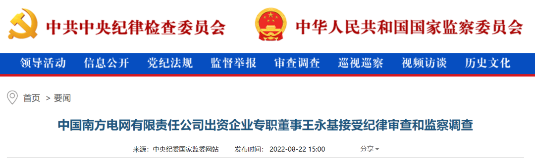 中紀(jì)委網(wǎng)站8月22日消息,中國(guó)南方電網(wǎng)有限責(zé)任公司出資企業(yè)專職董事王永基涉嫌嚴(yán)重違紀(jì)違法,目前正接受中國(guó)南方電網(wǎng)有限責(zé)任公司紀(jì)檢監(jiān)察組紀(jì)律審查和廣東省肇慶市監(jiān)察委員會(huì)監(jiān)察調(diào)查。