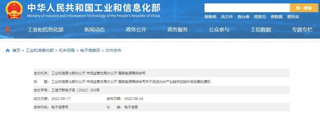 本網(wǎng)訊 8月24日,工信部辦公廳、市場監(jiān)管總局辦公廳、國家能源局綜合司發(fā)布《三部門關(guān)于促進(jìn)光伏產(chǎn)業(yè)鏈供應(yīng)鏈協(xié)同發(fā)展的通知》。