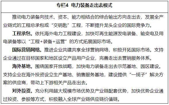 16.推動電力裝備走出去。緊緊圍繞高質(zhì)量共建“一帶一路”、深入實施《區(qū)域全面經(jīng)濟伙伴關系協(xié)定》,鼓勵優(yōu)勢電力裝備企業(yè)以多種方式加快走出去。引導企業(yè)取得國際認可的服務資質(zhì),帶動技術、裝備、標準和服務走出去。支持行業(yè)組織搭建走出去信息綜合服務平臺,提供法律、咨詢、風險評估等服務。