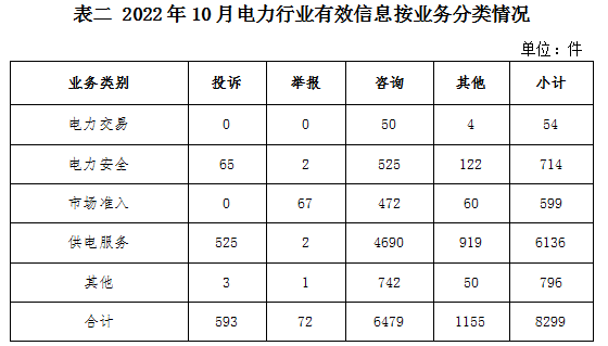 電力行業(yè)排在首位,有效信息數量為8299件,占全部有效信息的62.69%。群眾關注的內容主要集中在供電服務、電力安全、市場準入等方面。(2022年10月電力行業(yè)有效信息按業(yè)務分類情況見表二)