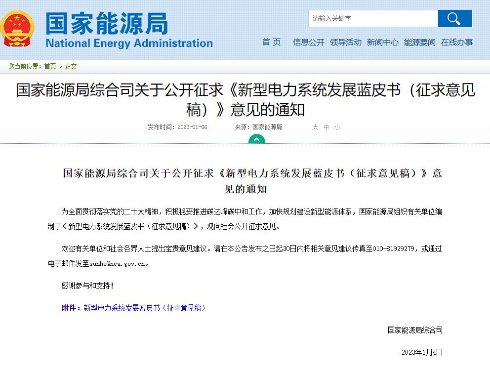 為全面貫徹落實(shí)黨的二十大精神,積極穩(wěn)妥推進(jìn)碳達(dá)峰碳中和工作,加快規(guī)劃建設(shè)新型能源體系,國(guó)家能源局組織有關(guān)單位編制了《新型電力系統(tǒng)發(fā)展藍(lán)皮書(shū)(征求意見(jiàn)稿)》,現(xiàn)向社會(huì)公開(kāi)征求意見(jiàn)。