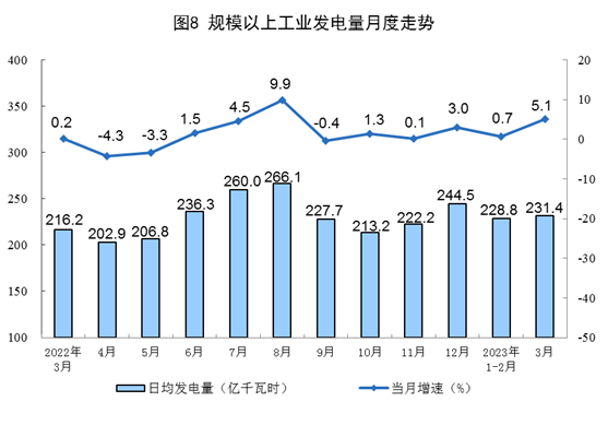 電力生產(chǎn)增速加快。3月份,發(fā)電7173億千瓦時,同比增長5.1%,增速比1—2月份加快4.4個百分點,日均發(fā)電231.4億千瓦時。1—3月份,發(fā)電20712億千瓦時,同比增長2.4%。