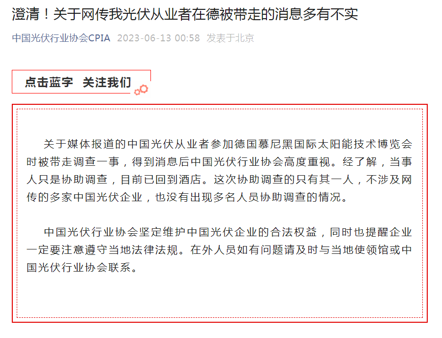 據(jù)“中國光伏行業(yè)協(xié)會CPIA”微信公眾號13日消息,關(guān)于媒體報道的中國光伏從業(yè)者參加德國慕尼黑國際太陽能技術(shù)博覽會時被帶走調(diào)查一事,得到消息后中國光伏行業(yè)協(xié)會高度重視。經(jīng)了解,當(dāng)事人只是協(xié)助調(diào)查,目前已回到酒店。這次協(xié)助調(diào)查的只有其一人,不涉及網(wǎng)傳的多家中國光伏企業(yè),也沒有出現(xiàn)多名人員協(xié)助調(diào)查的情況。