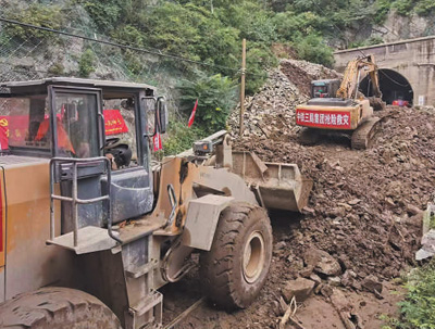 中國中鐵三局救援隊清理隧道洞口泥沙,搶修豐沙線。