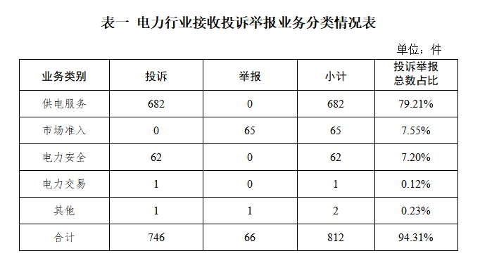 電力行業(yè)排在首位,數量為812件、占投訴舉報總數的94.31%,主要集中在供電服務、市場準入、電力安全等方面。