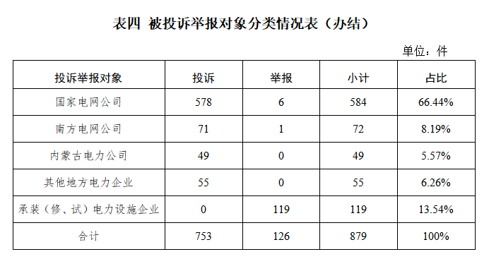 從被投訴舉報對象看,供電企業(yè)760件、占投訴舉報總數的86.46%,其中國家電網公司584件、占比66.44%,南方電網公司72件、占比8.19%,內蒙古電力公司49件、占比5.57%,其他地方電力企業(yè)55件、占比6.26%;承裝(修、試)電力設施企業(yè)119件、占比13.54%。