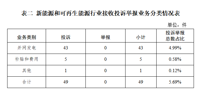 新能源和可再生能源行業(yè)排在第二位,數量為49件、占投訴舉報總數的5.69%,主要集中在并網發(fā)電、補貼和費用等方面。