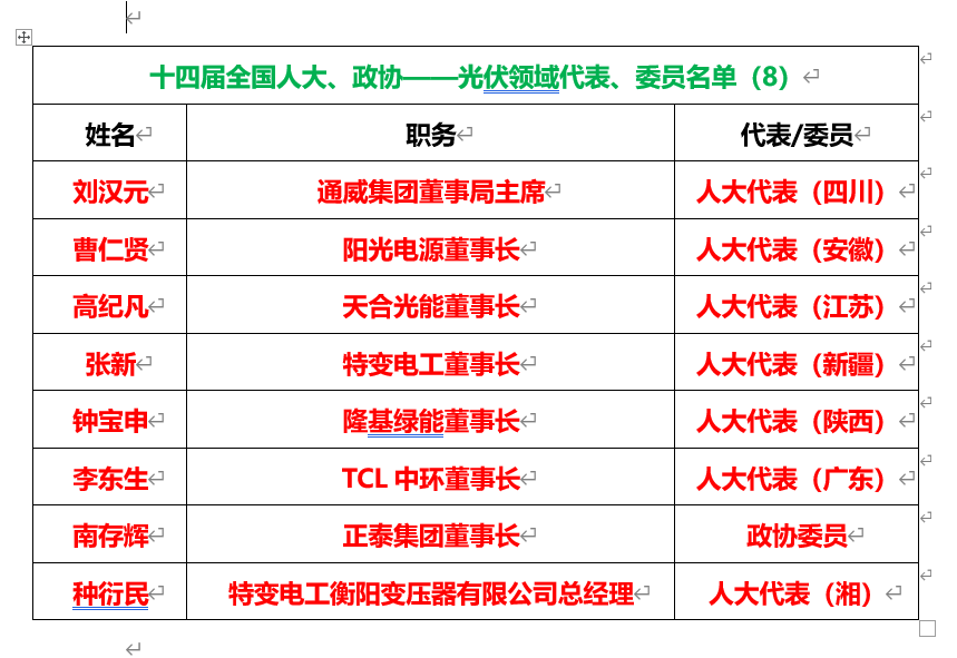 光伏領(lǐng)域共有8位行業(yè)領(lǐng)袖當(dāng)選十四屆全國人大代表、政協(xié)委員,數(shù)量創(chuàng)歷年之最。其中,特變電工有2人當(dāng)選,單家公司最多。
