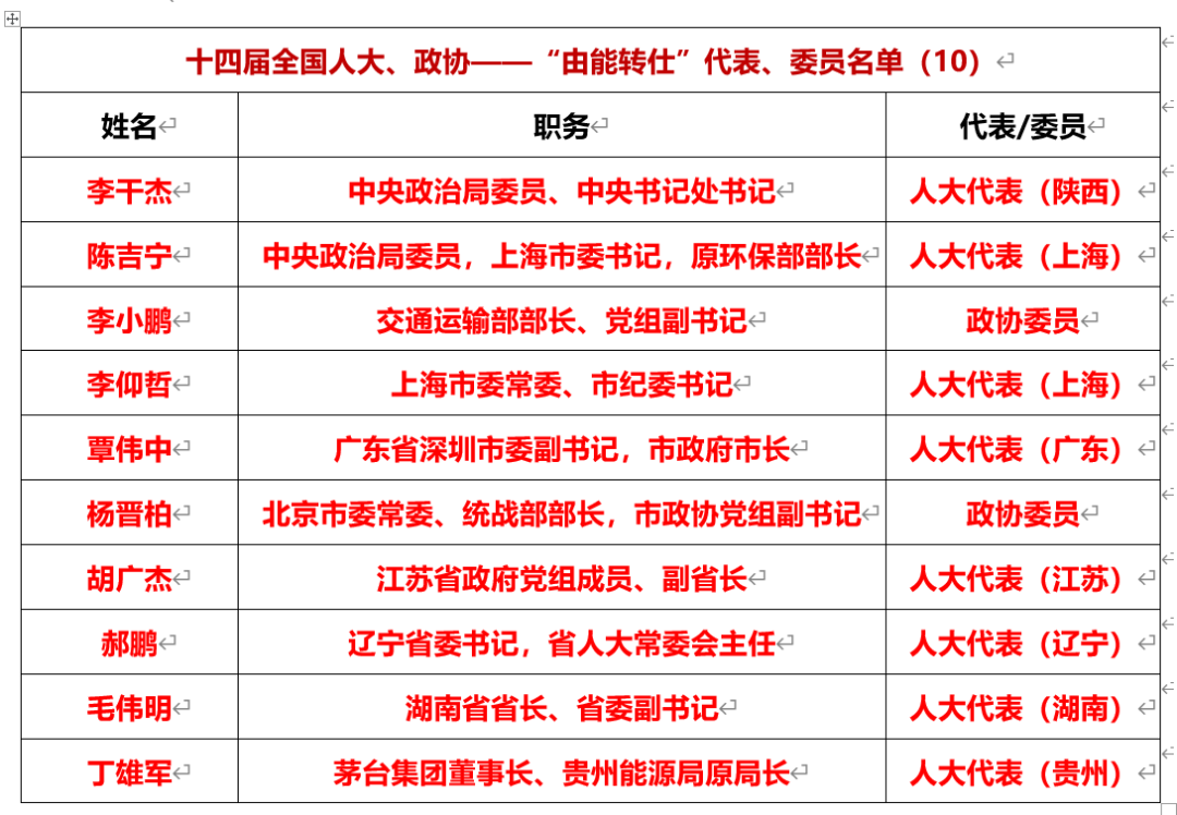 “由能轉(zhuǎn)仕”的十四屆全國人大代表、政協(xié)委員有10人,其中全國人大代表8人,政協(xié)委員2人。如中央政治局委員、中央書記處書記李干杰,曾任生態(tài)環(huán)境部原部長、黨組書記,中央政治局委員、上海市委書記陳吉寧曾任環(huán)保部部長,交通運(yùn)輸部部長李小鵬曾任中國華能總經(jīng)理,上海市委常委、紀(jì)委書記李仰哲曾任國家能源局副局長,深圳市長覃偉中曾任中國石油副總經(jīng)理,遼寧省委書記郝鵬曾任國務(wù)院國資委主任,江蘇省副省長胡廣杰曾任中國海油副總經(jīng)理,湖南省省長毛偉明曾任國家電網(wǎng)董事長,丁雄軍曾任貴州能源局原局長。