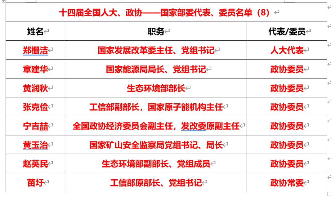 國家部委層面,有國家發(fā)展改革委黨組書記、主任鄭柵潔,生態(tài)環(huán)境部部長黃潤秋,國家能源局局長、黨組書記章建華,國家礦山安全監(jiān)察局黨組書記、局長黃玉治,工信部副部長,國家原子能機(jī)構(gòu)主任張克儉,全國政協(xié)經(jīng)濟(jì)委員會副主任,生態(tài)環(huán)境部副部長、黨組成員趙英民,國家發(fā)改委原副主任寧吉喆,工信部原部長、黨組書記苗圩8人。