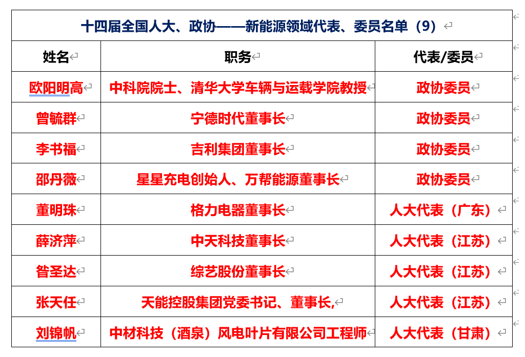 新能源領(lǐng)域有7人當(dāng)選十四屆全國人大代表、政協(xié)委員,格力電器董明珠、寧德時(shí)代曾毓群、吉利集團(tuán)李書福等人當(dāng)選。