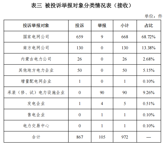 供電企業(yè)875件、占投訴舉報(bào)總數(shù)的90.02%,其中國(guó)家電網(wǎng)公司668件、占投訴舉報(bào)總數(shù)的68.72%,南方電網(wǎng)公司130件、占投訴舉報(bào)總數(shù)的13.37%,內(nèi)蒙古電力公司26件、占投訴舉報(bào)總數(shù)的2.67%,其他地方電力企業(yè)50件、占投訴舉報(bào)總數(shù)的5.14%,增量配電網(wǎng)企業(yè)1件、占投訴舉報(bào)總數(shù)的0.10%;承裝(修、試)電力設(shè)施企業(yè)90件、占投訴舉報(bào)總數(shù)的9.26%;發(fā)電企業(yè)5件,占投訴舉報(bào)總數(shù)的0.51%;售電企業(yè)1件、占投訴舉報(bào)總數(shù)的0.1%;電力交易中心1件、占投訴舉報(bào)總數(shù)的0.1%。