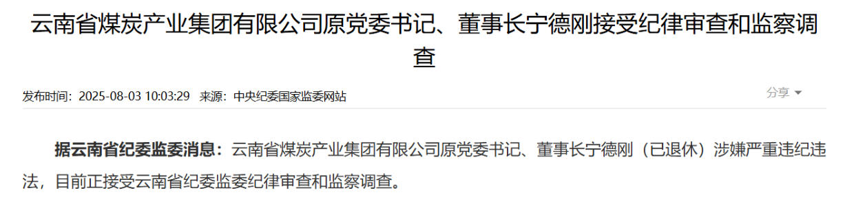 據(jù)云南省紀(jì)委監(jiān)委8月3日消息,云南省煤炭產(chǎn)業(yè)集團(tuán)有限公司原黨委書(shū)記、董事長(zhǎng)寧德剛(已退休)涉嫌嚴(yán)重違紀(jì)違法,目前正接受審查調(diào)查。