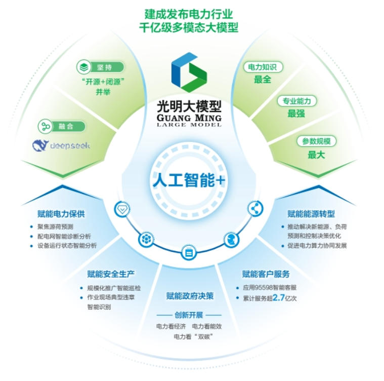 實施“人工智能+”專項行動,建成發(fā)布電力行業(yè)千億級多模態(tài)大模型——光明大模型。