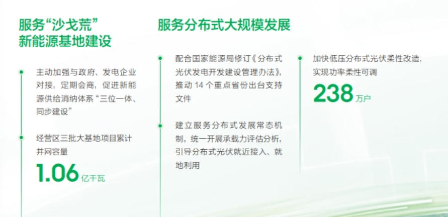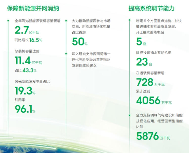促進新能源高質(zhì)量發(fā)展,經(jīng)營區(qū)三批大基地項目累計并網(wǎng)容量1.06億千瓦;加快低壓分布式光伏柔性改造,實現(xiàn)功率柔性可調(diào)238萬戶;全年風(fēng)光新能源裝機容量新增2.7億千瓦,同比增長16.5%;風(fēng)光新能源發(fā)電量占比19.3%,利用率96.1%;開工抽水蓄能電站5座,建成投運抽水蓄能機組23臺,在運裝機容量累計達到4056萬千瓦;經(jīng)營區(qū)新型儲能達到5876萬千瓦。