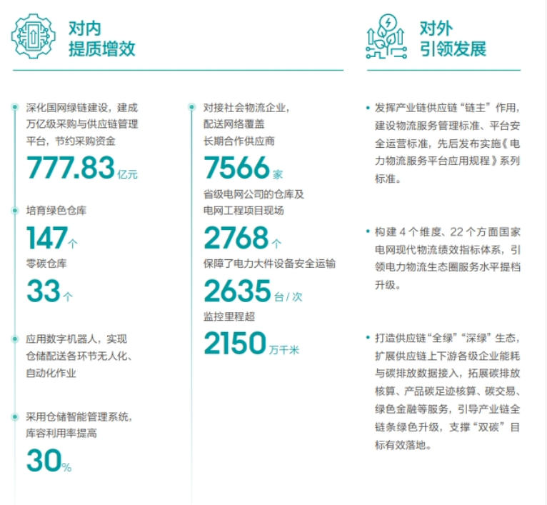 打造綠色數(shù)智供應(yīng)鏈,對內(nèi)深化國網(wǎng)綠鏈建設(shè),建成萬億級采購與供應(yīng)鏈管理平臺,節(jié)約采購資金777.83億元;對外構(gòu)建4個維度、22個方面國家電網(wǎng)現(xiàn)代物流績效指標(biāo)體系,引領(lǐng)電力物流生態(tài)圈服務(wù)水平提檔升級。