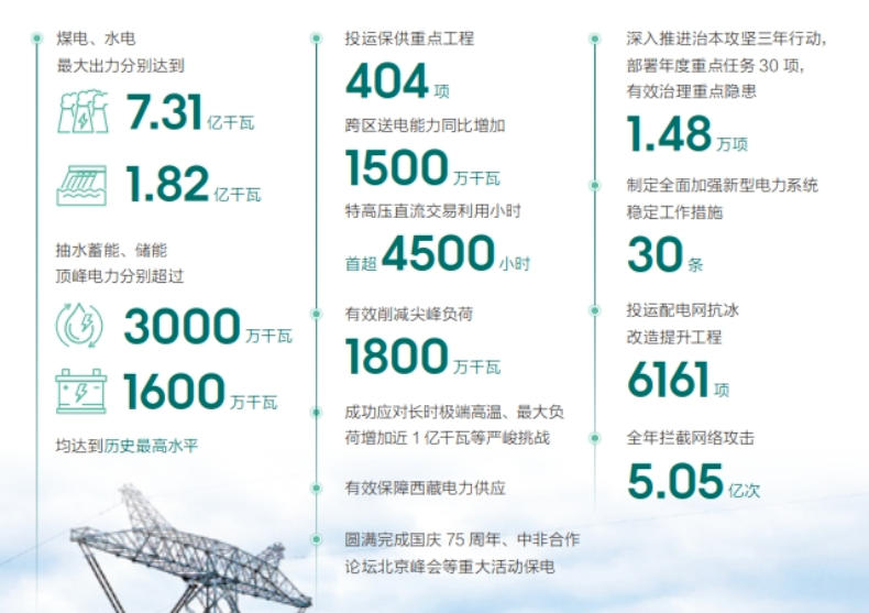 投運保供重點工程404項、配電網(wǎng)抗冰改造提升工程6161項,攔截網(wǎng)絡(luò)攻擊5.05億次,成功應(yīng)對長時極端高溫、最大負(fù)荷增加近1億千瓦等嚴(yán)峻挑戰(zhàn),解決配電網(wǎng)抗災(zāi)脆弱性問題,消除縣域聯(lián)系薄弱等網(wǎng)架結(jié)構(gòu)短板。