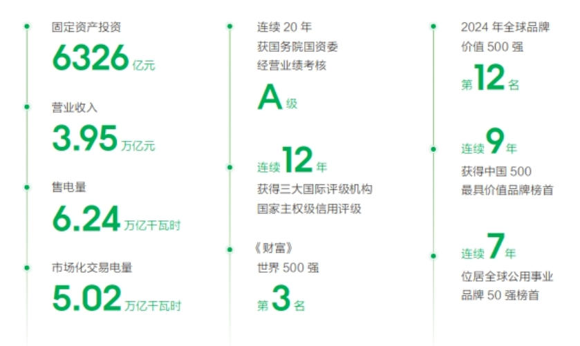 2024年完成固定資產(chǎn)投資6326億元,達成營業(yè)收入3.95萬億元;全年售電量6.24萬億千瓦時,市場化交易電量5.02萬億千瓦時;并網(wǎng)發(fā)電裝機容量26.3億千瓦,其中風(fēng)光新能源并網(wǎng)裝機容量11.4億千瓦;累計建成特高壓工程“22交16直”38項,跨區(qū)跨省輸電能力3.4億千瓦,建成全球技術(shù)水平最高、配置資源能力最強、并網(wǎng)裝機規(guī)模最大、安全運行時間最長的交直流混聯(lián)特大型電網(wǎng)。