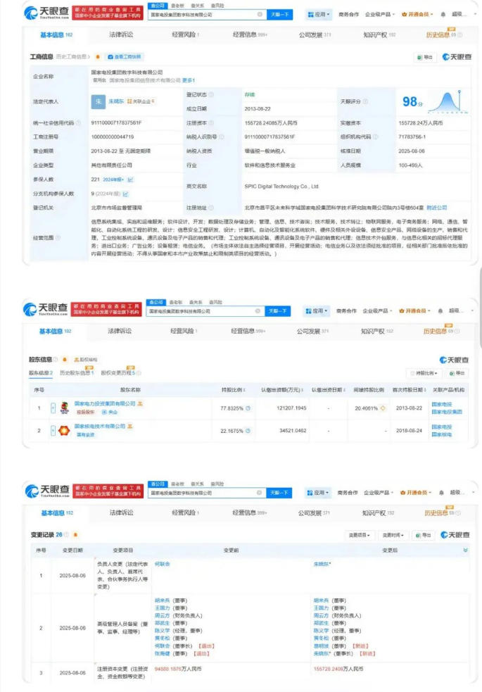 天眼查App顯示,近日,國家電投集團數(shù)字科技有限公司發(fā)生工商變更,何聯(lián)會卸任法定代表人、董事長,由朱曉東接任,同時注冊資本由約9.49億人民幣增至約15.57億人民幣。