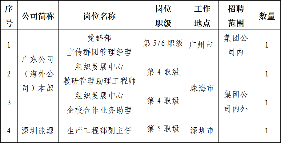 根據(jù)工作需要,依據(jù)公司招聘管理相關(guān)規(guī)定,現(xiàn)對廣東公司(海外公司)本部及系統(tǒng)內(nèi)部分三級單位共4個崗位進(jìn)行公開招聘。