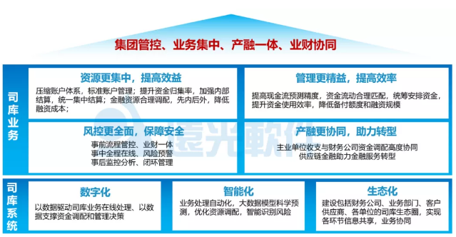 結(jié)合集團企業(yè)發(fā)展需求和業(yè)界實踐經(jīng)驗,司庫管理體系建設(shè)需滿足“資源更集中、管理更精益、風(fēng)控更全面、產(chǎn)融更協(xié)同”四個標準,以數(shù)字化、智能化的司庫管理信息系統(tǒng)為支撐,以“集團管控、業(yè)務(wù)集中、產(chǎn)融一體、業(yè)務(wù)協(xié)同”為管理目標。