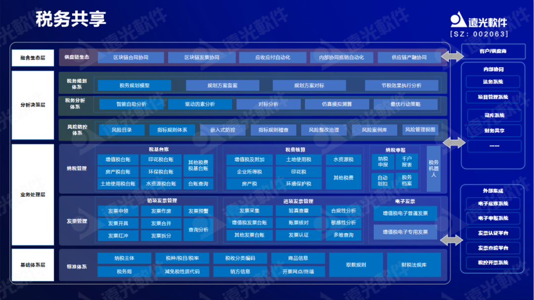 應(yīng)用先進(jìn)數(shù)字技術(shù)建立稅務(wù)標(biāo)準(zhǔn)體系,構(gòu)建全稅種、全業(yè)務(wù)屬性發(fā)票池,并通過(guò)搭建稅企直連通道服務(wù)建立全稅種智能辦稅平臺(tái),實(shí)現(xiàn)全稅種的計(jì)稅、報(bào)稅、繳稅、歸檔全流程智能化處理。同時(shí),通過(guò)引入稅務(wù)局的監(jiān)管和審計(jì)規(guī)則來(lái)構(gòu)建稅務(wù)稽查模型,實(shí)現(xiàn)360度的稅務(wù)風(fēng)險(xiǎn)掃描,全面助力集團(tuán)企業(yè)推進(jìn)稅務(wù)管理的標(biāo)準(zhǔn)化、數(shù)字化、共享化、智慧化轉(zhuǎn)型。