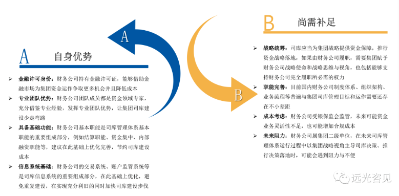 有不少企業(yè)會有困惑,是否可以以財務公司為基礎構建司庫管理體系?這個不建議直接用“是\否”來回答,或許回答“部分可以”會比較適宜。從財務公司優(yōu)勢和可能存在的不足兩個角度進行簡要分析,如圖: