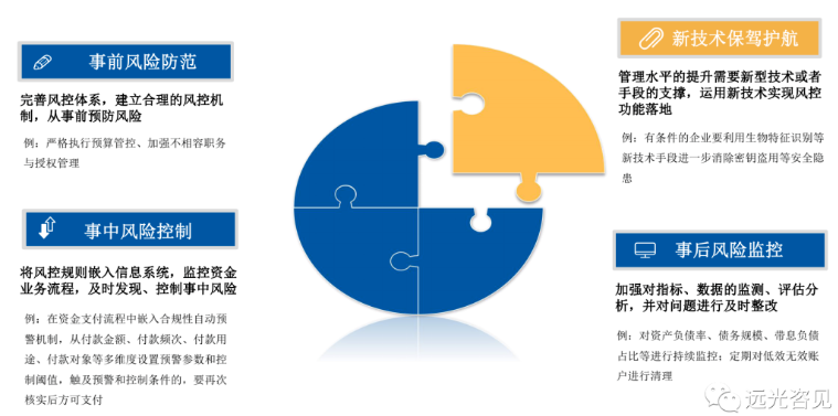 從信息化落地角度加強資金業(yè)務全面監(jiān)控,建議從四個維度展開:事前風險防范、事中風險控制、事后風險監(jiān)控、新技術保駕護航。