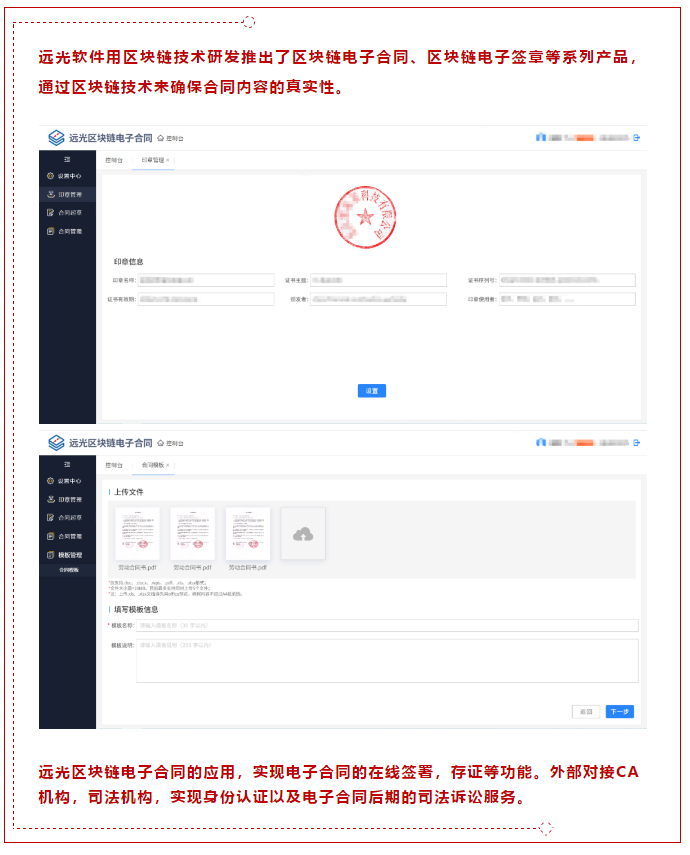 遠(yuǎn)光軟件用區(qū)塊鏈技術(shù)研發(fā)推出了區(qū)塊鏈電子合同、區(qū)塊鏈電子簽章等系列產(chǎn)品,通過區(qū)塊鏈技術(shù)來確保合同內(nèi)容的真實(shí)性。