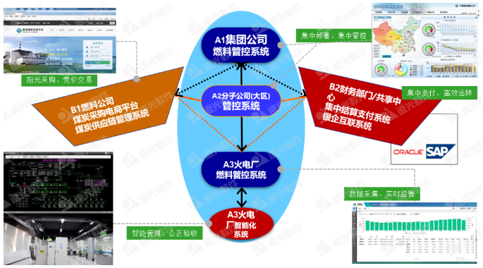 在縱向貫通方面,通過在集團(tuán)公司總部部署燃料管控信息系統(tǒng),以集中部署、集中管控為實(shí)施原則,發(fā)揮集團(tuán)公司的計(jì)劃管理和實(shí)施監(jiān)督的管理職能。在分(子)公司部署燃料管控系統(tǒng),作為燃料縱向三級(jí)管控中承上啟下的“橋梁”,對(duì)下屬電廠采購(gòu)、入廠、結(jié)算實(shí)施監(jiān)管,同時(shí)進(jìn)行區(qū)域內(nèi)調(diào)控;協(xié)助集團(tuán)公司進(jìn)行保供控價(jià)的執(zhí)行,落實(shí)集團(tuán)對(duì)燃料指標(biāo)管控要求。在電廠部署燃料管控信息系統(tǒng)(A2)與燃料智能化系統(tǒng)(A3),作為燃料管控的執(zhí)行主體,內(nèi)容包括入廠計(jì)量過程智能化系統(tǒng)、采制樣過程智能化系統(tǒng)、化驗(yàn)管理網(wǎng)絡(luò)化系統(tǒng)、煤場(chǎng)管理數(shù)字化系統(tǒng)、入爐煤管理系統(tǒng)、門禁系統(tǒng)、燃料集中監(jiān)控系統(tǒng)和監(jiān)控中心、燃料業(yè)務(wù)管理系統(tǒng)。