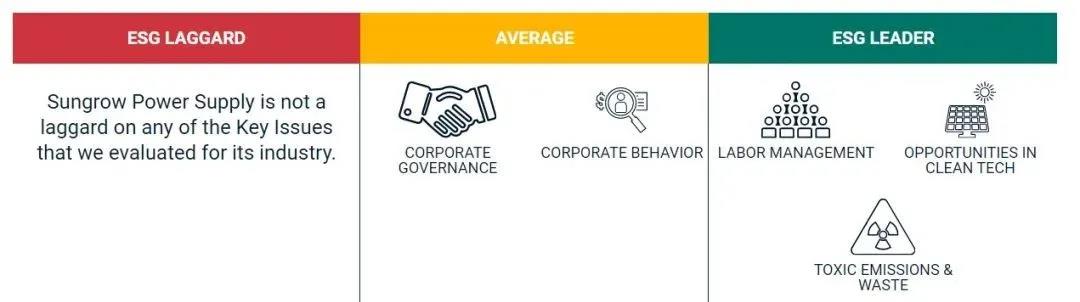 核心ESG議題方面,陽(yáng)光電源在勞工管理、清潔能源機(jī)遇,以及有害排放和廢棄物三個(gè)指標(biāo)方面都處于行業(yè)領(lǐng)先位置,沒(méi)有議題落后于同業(yè)企業(yè)。