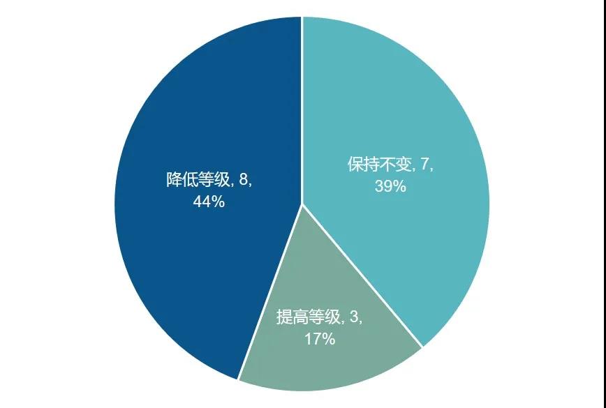 在18家ESG評(píng)級(jí)結(jié)果得到調(diào)整的A股中,有8家公司(44%)的評(píng)級(jí)被調(diào)低,有7家公司(39%)的評(píng)級(jí)保持不變,僅有3家公司(17%)的評(píng)級(jí)被調(diào)高。
